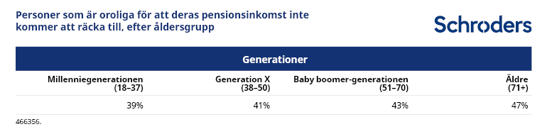 Nästan hälften (47 %) av de som är 71 år eller äldre och 43 % av baby boomer-generationen (51–70-åringar) uppgav att de var oroade över att deras pensionsinkomst inte kommer att räcka till. Motsvarande andel för millenniegenerationen (18–37-åringar) var 39 %.