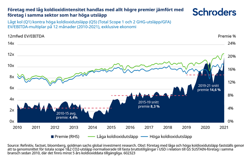 Företag som har låga utsläpp, mätt som utsläpp inom scope 1 och scope 2, börjar redan få en premie på aktiekursen jämfört med motsvarande företag i samma sektor som har högre utsläpp, vilket framgår av diagrammet nedan. Utsläpp i scope 1 orsakas direkt av ett företag genom dess verksamhet, medan scope 2 inkluderar den energi som företaget använder.