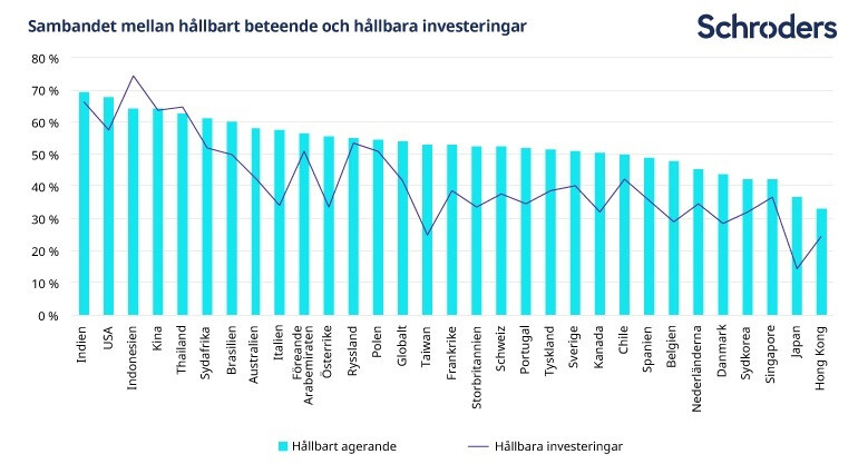 I Schroders globala investerarstudie från 2017 fann man att länder med en högre andel konsumenter som agerar ansvarsfullt och hållbart, även tenderar att ha fler investerare som är benägna att investera hållbart.