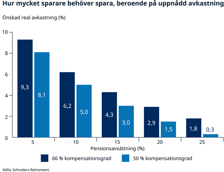 I grafen nedan visas en analys som utförts av Schroders. Grafen utgår från en person som börjat pensionsspara vid 30 års ålder och har en årslön på 390 000 kronor (som stiger i linje med inflationen). Det visar den reala årliga avkastning – där inflationen tas i beaktande – som skulle behövas för att uppnå två inkomstnivåer: 50 % eller 66 % av den inkomst man har när man går i pension. Dessa mål är vanliga i sammanhanget. Grefen förutsätter också att pensionspengarna kommer att tas ut under i genomsnitt 18 års tid.