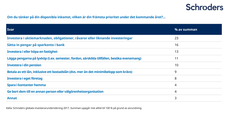 Viktig information: Schroders gav Research Plus Ltd i uppdrag att mellan den 1 och 30 juni 2017 genomföra en oberoende webbaserad studie av 22 100 investerare i 30 länder runt om i världen, bland annat Australien, Brasilien, Kanada, Kina, Frankrike, Tyskland, Indien, Italien, Japan, Nederländerna, Spanien, Storbritannien och USA. I undersökningen definieras ”investerare” som personer som kommer att investera minst 10 000 euro (eller motsvarande) under de kommande 12 månaderna och som har gjort förändringar i sina investeringar under de senaste tio åren. De här individerna representerar investerare i alla de länder som ingår i studien.