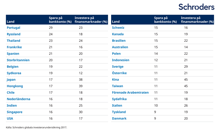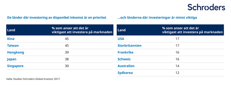 Schroders globala investerarundersökning 2017, där drygt 22 000 investerare runt om i världen deltog, kom fram till att benägenheten att investera på marknaderna var starkast i Asien och svagast i Nord- och Sydamerika samt Europa.